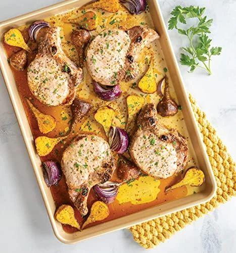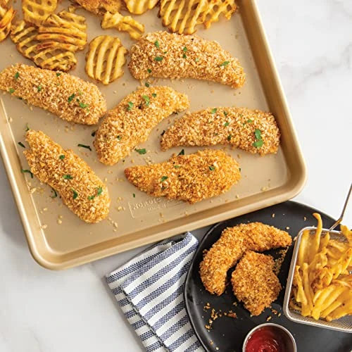 - This half sheet baking pan has a premium PFOA-free non-stick surface to save the hassle by releasing food effortlessly and making clean up simple